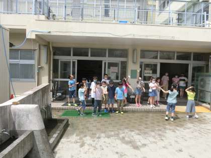 この暑さをすこしでも和らげるため学校主事さんが北昇降口入口にミストシャワーを取り付けてくれました。子どもたちは大喜びでした。今後、東昇降口にも設置する予定です。