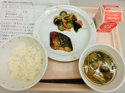 今日は、ごはん、牛乳さ、さば七味焼き、梅ドレッシングサラダ、もやしとなすのみそ汁です。