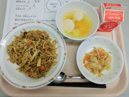 今日は、塩焼きそば、牛乳、ラーパーツァイ、白玉ポンチです。