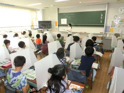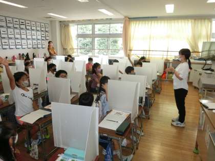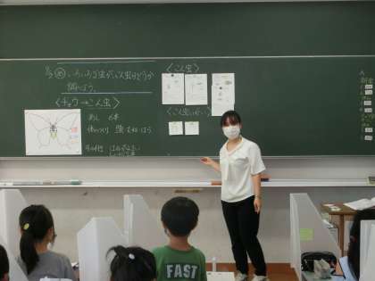 3年生の教室では理科「こん虫」をしていました。そのクラスは、先日、学校の隣にある提供公園に虫を探しに行きました。今日の授業では、こん虫と虫を見分ける方法を考えました。「こん虫」とは、頭・胸・腹に分けられていること。あしが胸から6本(3対)あることを学びました。昆虫・虫の世界はとても奥深く、例外もあります。しかし、小学校3年生では先ほどのような虫をこん虫と呼んでいます。子どもたちは、虫が好きです。とても、活気のある授業でした。