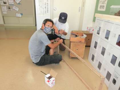 学校主事さんが、子どもたちの学習のためにパーテーションを作っています。音楽の授業で飛沫が飛ぶことを防ぐものです。今後、授業で活用していきます。ありがとうございます。