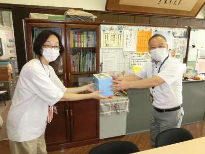 今年度も、様々な物品を寄付していただきました。本日は非接触式体温計6台をいただきました。子どもたちのために有効に使わせていただきます。