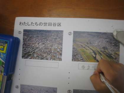 世田谷区の数か所の航空写真を見て、どの辺の写真かあてます。世田谷区の様々な様子を調べるために、興味関心をもたせるためです。子どもたちは、早く調べてみたいと意欲的になりました。