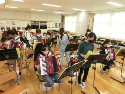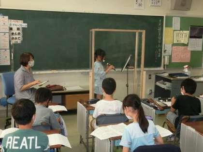 9月28日(月)音楽では工夫して授業をしてます。6年生の器楽合奏は、飛沫感染を警戒して、鍵盤ハーモニカやリコーダーを使わず演奏をします。中学年のリコーダーでは、パーテーションを用いて飛沫感染に気を付けて1人ずつ行っています。
