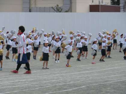 青空のもと、太陽の光に反射したポンポンが眩しいです。頑張れ1年生!