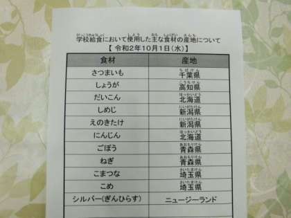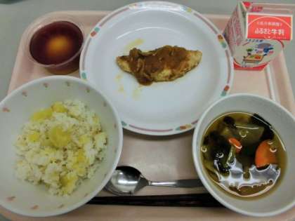 今日は、さつまいもごはん、牛乳、揚げ魚のきのこおろしポン酢、根菜のすまし汁、お月見ゼリーです。