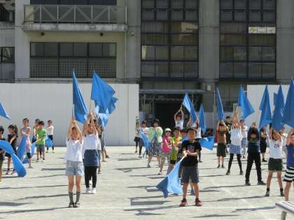 青空に青色のフラッグ!格好いいです。ダイナミックな踊り、当日の楽しみです!