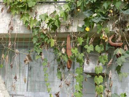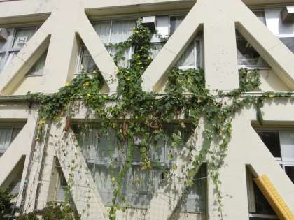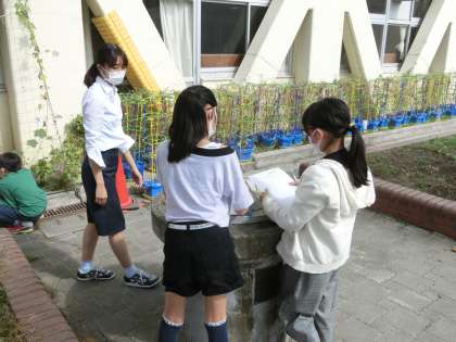 北校舎にはヘチマが伸び、今にも3階までたどり着きそうです。4年生が理科の学習で観察をしました。