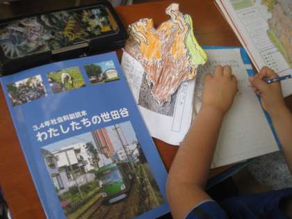 世田谷区の勉強です。世田谷区の人口分布からわかることをもとに、駅や線路が多い所に人が多い訳を考えました。難しい内容でしたが、子どもたちはよく考えていました。一生懸命考える子ども達の姿勢は立派です。