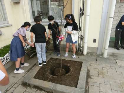 今日、委員会活動の時間に、代表委員会と園芸委員会とで塚戸小学校創立145周年記念植樹を行いました。植樹した木は「陽光(ようこう)」という桜です。今回、植樹した桜の木がこれからの塚戸小学校を見守ってくれるでしょう。創立150年、200年と大切にしていきたいと思います。