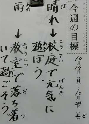 10月19日(月)新しい1週間を迎えました。先週は開校145周年記念ウイークでした。今週も開校145周年を記念した全校児童集合写真の撮影、教育実習の開始、ボランティアサークルのおたまじゃくしさんの活動、山の木文庫さんによる本の読み聞かせなど、盛りだくさんの行事があります。今週の生活目標は「晴れの日は、校庭で元気に遊ぼう! 雨の日は、教室で落ち着いて過ごそう」です。先週は、晴れの日のけがが多い1週間でした。安全に気を付けて過ごしたいですものです。