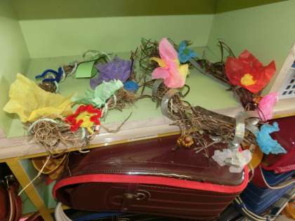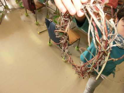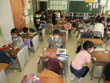 先日、あさがおのつるを取り、リース作りをしました。今日の学習では、作ったリースにどんぐりや葉っぱを付けて飾る学習をしました。どんぐりは祖師谷公園に行ったときのものです。個性あふれるリースができました。