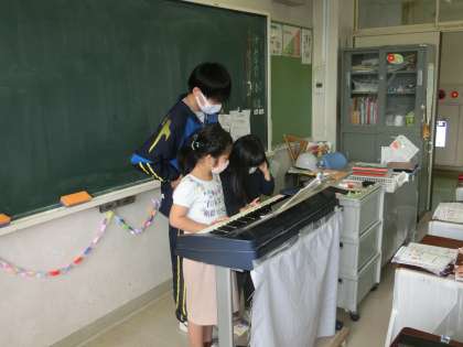 2年生の日本語の授業で筆と墨を使って字を書く。2年生の生活科の調べ学習ではグループで生き生きと取り組んでいました。2年生の音楽では「山のポルカ」に挑戦しました。