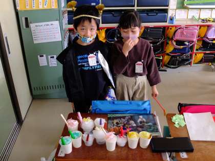 タピオカ屋、輪投げ屋、くじ引き屋、りんごあめ屋、金魚すくい屋、たこ焼き屋、かき氷屋、射的屋、チョコバナナ屋とたくさんのお店が並びました。お店だけではなく、はっぴ・浴衣・はちまきなどの衣装を用意したり、お祭りのBGMをかけたり、太鼓をたたいたり、踊ったりと本物のお祭りを再現すべく工夫がありました。「いろんなお祭りにいったことがあるけど、今まで一番楽しかった。」と子どもたちの声です。