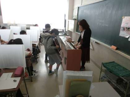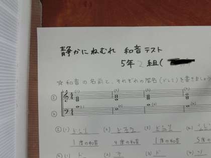 5年生の音楽の様子です。「静かにねむれ」という曲のアコーディオンテストを行っていました。全員取り組みます。みんな真剣に取り組んでいました。