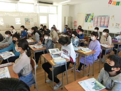 6年生の外国語では「建物や施設の名前」を英語で伝え合っていました。なかなか難しい単語もありましたがみんな一生懸命に取り組むことができました。