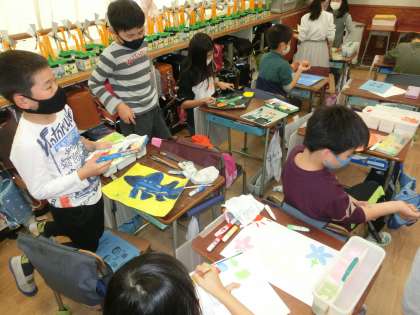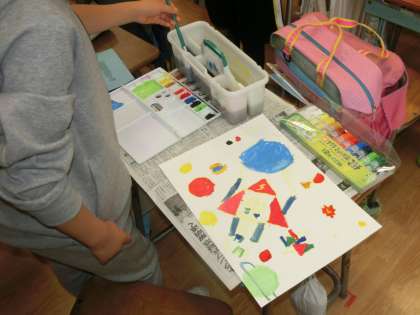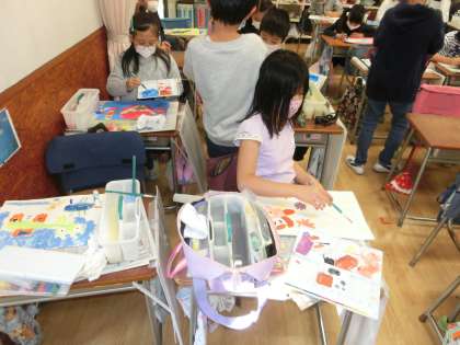 3年生の図工では「不思議な乗り物」と題して、一人一人自分が想像した乗り物を描いていました。チョークで線を描き、絵の具で塗って、ポスターカラーペンで仕上げることができました。