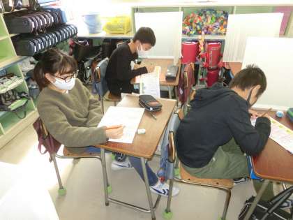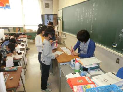 5年生のある教室です。漢字の学習に取り組んでいます。とても丁寧に書いています。担任の先生も一人一人のドリルを確認しています。微笑ましい光景です。