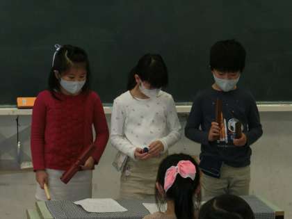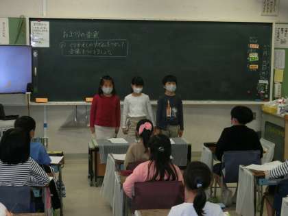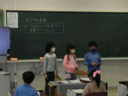 2年生の音楽では、複数の楽器を使って「おまつりの音楽」を表現しました。拍子木やタンバリン、カスタネットなど、子どもたちは楽しみながら学習に取り組んでいました。