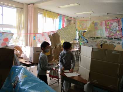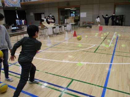 5年生は、教室と体育館にわかれて出し物をしました。迷路やもぐらたたき、エアホッケーなど、手作りのゲームがたくさんありました。大がかりなゲームが多く、高学年らしい出し物となりました。来年度は最高学年なので、どんなお店を出すのか楽しみになりました。