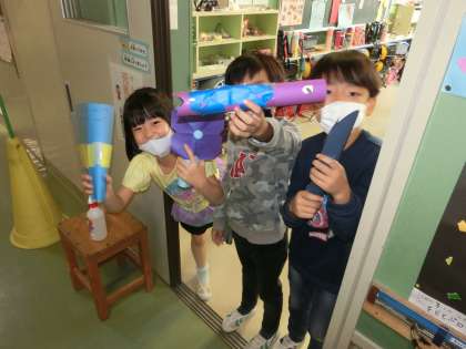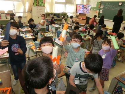 1年生の図工では、画用紙を用いて「かみこうさく」を楽しんでいました。私が教室に伺うと「見て、見て、頑張って作ったんだ!」と声を掛けてくれました。自分の作りたいものを、作る楽しさを実感していました。