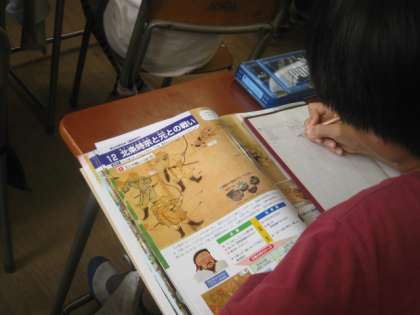 元寇の授業です。元寇の戦い方、その影響などを絵図を見て調べます。子供たちは、資料を見てわかることを積極的に発言していました。話し合うことが大好きな子になっています。
