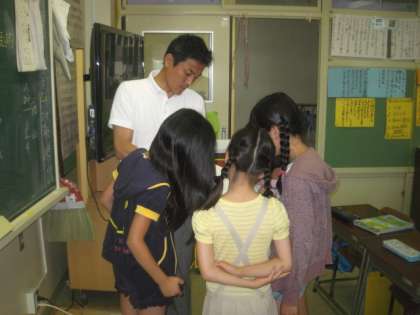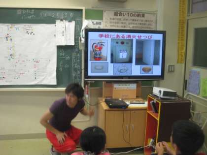学校の消火設備を調べて、その分布からわかることを考えます。最後に防火管理者の副校長先生に話してもらいました。事実から考える力が育っています。