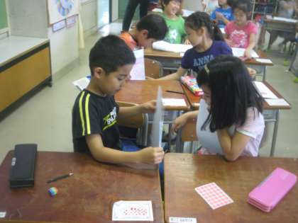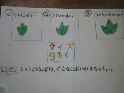 自分の育てた野菜についてわかったことをクイズやニュースに表しました。今日は、それを友達に出しっこをします。やっていくうちにだんだんうまくなってきます。子どもの変容は大きいです。