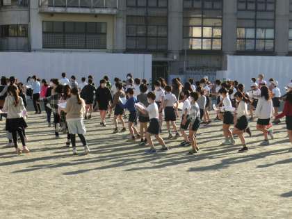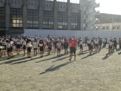 朝の短時間学習でステップダンスに取り組みました。体力向上の一環の学習で、音楽に合わせて踊ります。寒さの厳しい朝でしたが、一生懸命に取り組みました。このステップダンスの取り組みは全学年で行っています。