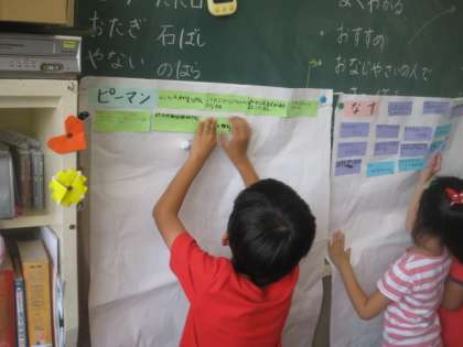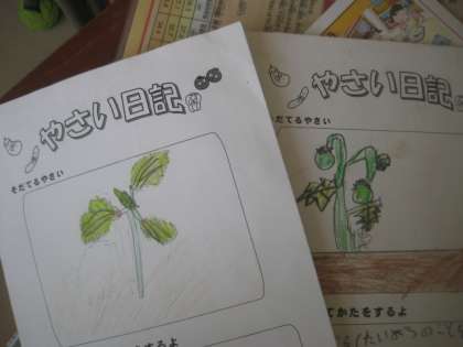 子どもたちは、野菜を育てていくなかで、いろいろな気付きをしてきました。それを「野菜図鑑」としてまとめていきます。今までの野菜日記をみたり、友達の考えを取り入れたりして、来年の2年生が参考にするわかりやすい図鑑を作っていきます。群と成長した5組さんでした。