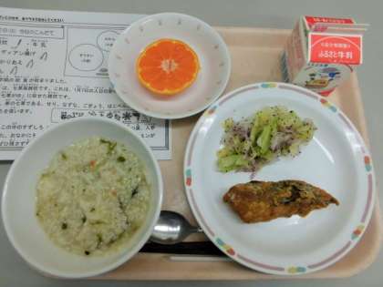 今日は、七草風雑炊、牛乳、鯖のインディアン揚げ、野菜のゆかりあえ、菊花みかんです。