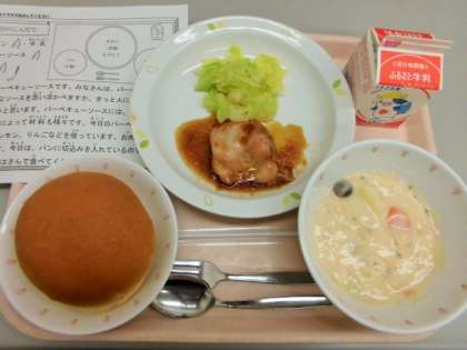 今日は、スライス入り丸パン、牛乳、鶏肉のバーベキューソース、野菜のひとしお、クリームシチューです。