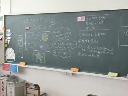 1年生の図工では「できたらいいな、こんなこと」という学習に取り組みました。日常の生活ではできないことを「絵の中でできること」を想像して描きました。星に乗りたい、ケーキのお風呂に入りたい、世の中にないような車に乗りたい、、、、など、思い思いの絵を想像して描きました。