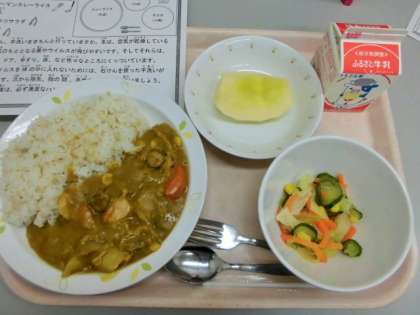 今日は、ジャーマンカレーライス、牛乳、キャベツサラダ、りんごです。