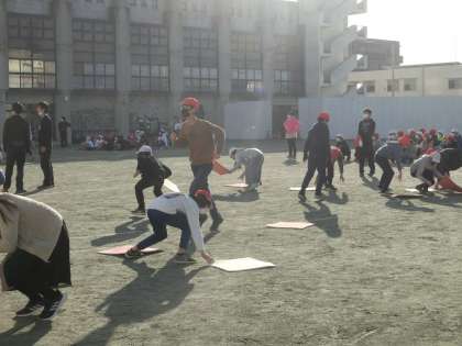 今朝のわくわくモーニングで「リバーシー」というゲームを行いました。板を裏返したり、裏返された板を元に戻すために裏返したりします。体を使ってオセロをひっくり返すゲームと思っていただければと思います。短時間ですが、全力で動きますので体力の向上にもってこいのゲームです。