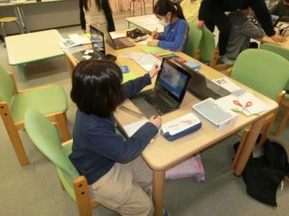 4年生の総合的な学習の時間では「みんなで考えよう、よりよいくらし〜ユニバーサルデザインってどんなもの〜」と題して、ユニバーサルデザインについて調べ学習を行いました。今日は身の回りで使われている「ユニバーサルデザイン」の目的や場所、誰のため等について熱心に調べました。