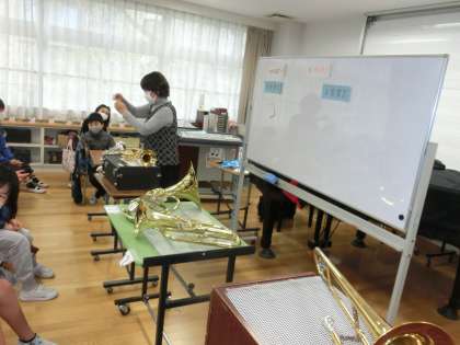 3年生の音楽では「いろいろな金管楽器」という学習を行いました。トランペット、ホルン、チューバ、トロンボーン等の楽器の特徴を学びました。鈴木先生もご自宅からホルンを持ってこられ、子どもたちは光輝いた金管楽器を目にして喜んでいました。4年生では木管楽器を学習します。