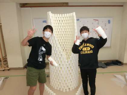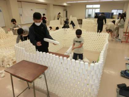 6年生の図工では造形遊び「紙コップ、コップ、コップ、コップ」を行いました。造形的な見方を働かせて紙コップを並べたり、積んだりして空間に働きかけることがねらいです。1つ1つの紙コップはただの紙コップですが、組み合わさったり、重ねたりすることで何とも芸術的になりました。子どもたちは造形的な見方を十分働かせて活動を楽しみました。感染症対策も確実に行い実施したことをあわせてお伝えします。