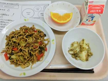 今日は、ソース焼きそば、牛乳、じゃがいもの香味あえ、いよかんです。