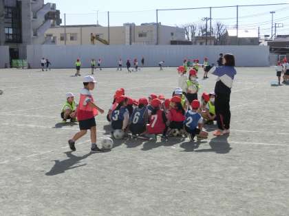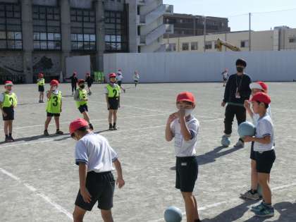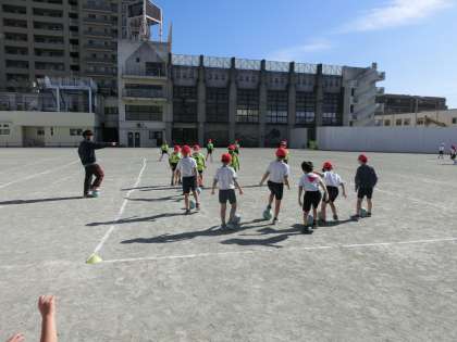 2年生の体育ではボール蹴りあそびに取り組みました。ボールにも慣れ、ボールを蹴って走る競争やミニゲームをして楽しみました。基礎的な学びの積み重ねが高学年の体育につながっていきます。