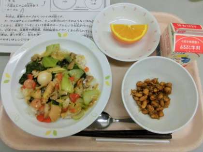今日は、中華丼、牛乳、大豆とじゃこの甘辛あげ、ネーブルです。