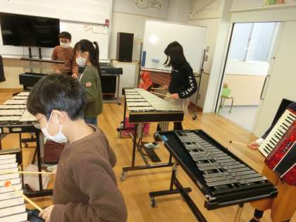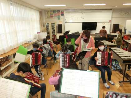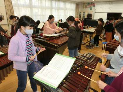 5年生の合奏「威風堂々」では、子どもたちが本当に一生懸命に取り組んでいます。各パートに分かれて、音楽の先生や友達から教えてもらったりしています。5年生5クラス、どのクラスも練習に燃えています。5年生、ファイト!