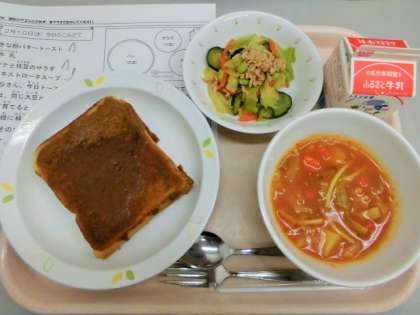 今日は、きなこバタートースト、牛乳、ツナと枝豆のサラダ、ミネストローネスープです。