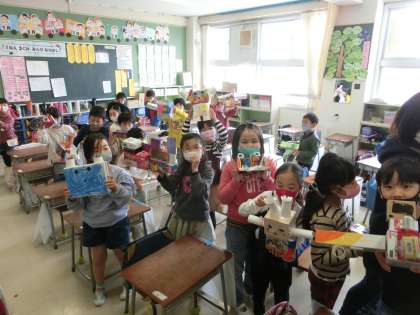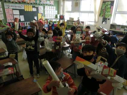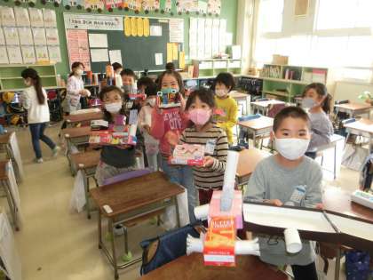1年生の図工では「はことはこを組み合わせて」という学習に取り組みました。家庭から持ってきた箱を上手に組み合わせて作りました。今日は完成した作品を見合っていました。