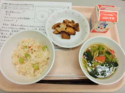今日は、鮭と枝豆のごはん、牛乳、れんこんとさつまいもの甘酢揚げ、そうめん汁です。