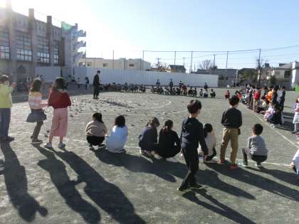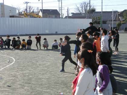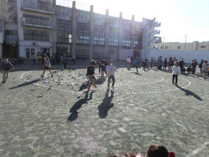 わくわくモーニングでは3年生がジャイロボールに挑戦しました。「投げる力」を高めるきっかけになればと思います。学年で輪を作って、クラスごとに真ん中の円に向かって投げ入れました。