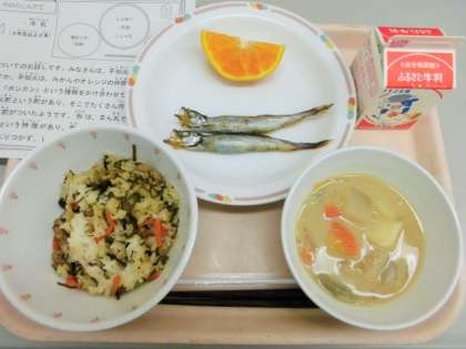今日は、磯おこわ、牛乳、焼きししゃも、利休汁、不知火です。