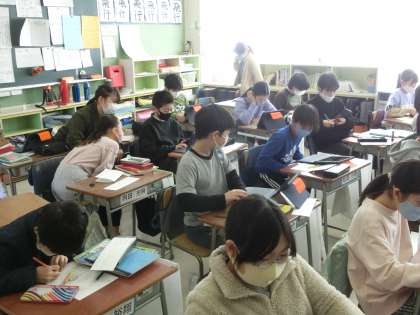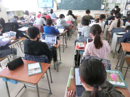 5年生の教室では先日配布されたタブレットを使って学習に取り組みました。テーマを決めて調べていました。今週、塚戸小では高速ネットワーク通信が開通しました。ご家庭においてもタブレットパソコンの扱い方に注意しながらも、有効に活用してください。