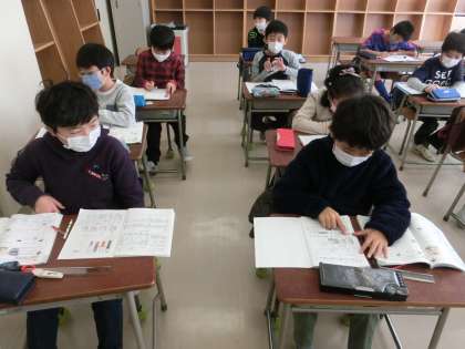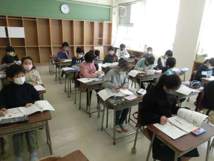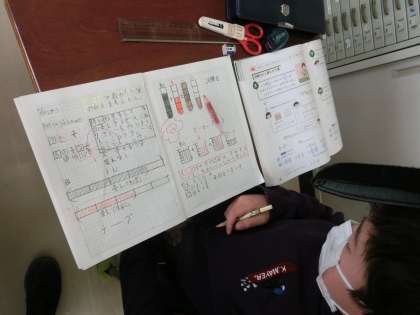 4年生では「分数の大きさとたし算・ひき算」の学習をしています。いよいよ今日から、分数のたし算の学習が始まりました。4/5+3/5の計算も、図に表し「1/5をもとにしている」ことが分かれば答えは7/10ではなく7/5になることが見えてきます。ずいぶん速く、わかりやすく図を書くことができるようになってきた4年生。友達のノートを見て回る時間も設け、考えを深めることができました。明日からの学習も楽しみです。
