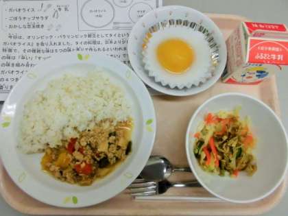 今日は、ガパオライス、牛乳、ごぼうチップサラダ、おかしな目玉焼きです。